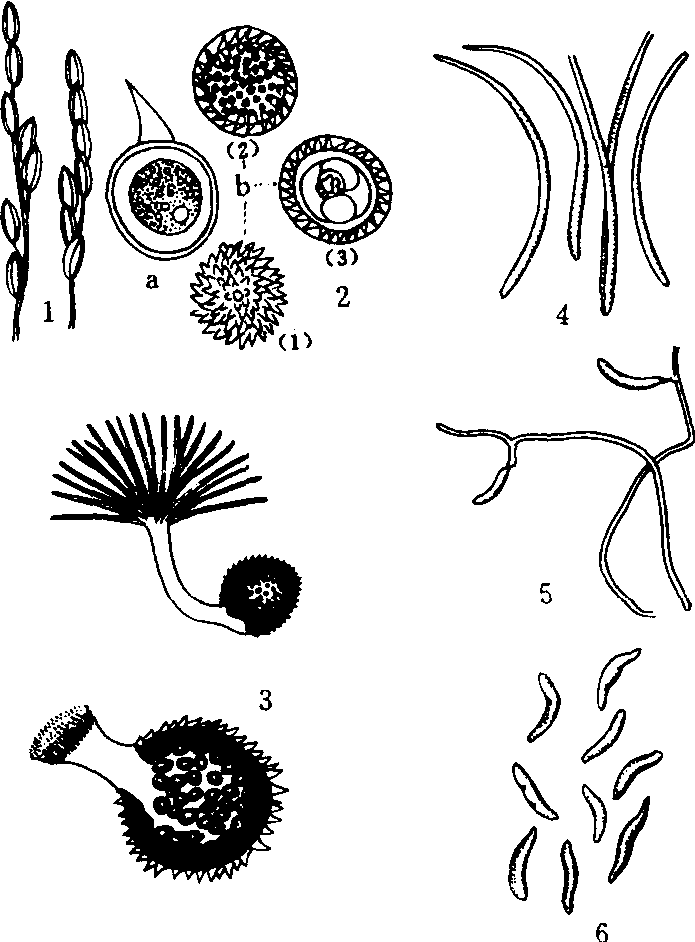 1.症状; 2.孢子 a.不孕孢子 b.在不同焦距上孢子表面的形态 (1)表面 (2)齿状突起基部 (3)剖面图3.孢子萌芽; 4.小孢子; 5.小孢子生次小孢子; 6.次生小孢子 (3~6林传光图)