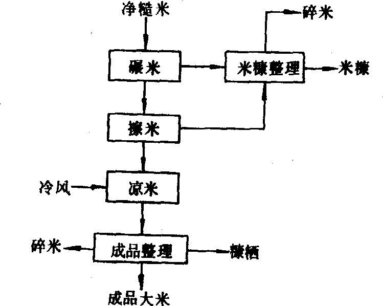 图2 砻谷及砻下物的分离工艺流程 砻谷及砻下物的分离 经过清理除杂后的稻谷称为净谷。净谷须首先砻谷脱壳,制成纯净的糙米,然后才能进行碾米。由于稻谷经过砻谷机一次脱壳不能使稻谷全部脱壳,砻下物还需进行分离,其工艺流程见图2。❶砻谷。采用砻谷机脱去稻谷颖壳,尽量保持糙米完整(见砻谷)。 ❷谷壳分离。利用谷壳与谷糙混合物悬浮速度的不同,采用风选法分离谷壳。常用的谷壳分离设备有吸风分离器和稻壳分离器等。谷壳分离指标是: 每100千克稻壳中含饱满谷粒不应超过30粒;谷糙混合物中含稻壳量不应超过1%。 ❸谷糙分离。砻下物经分离出稻壳后,剩下的是谷糙混合物,须继续进行分离。分出的稻谷称为回砻谷,再送入砻谷机脱壳,加工好的为糙米,供碾米用。谷糙分离方法一般有两种:按粒度分选和按比重、弹性、表面性质分选。谷糙分离设备可相应地分为,谷糙分离筛和谷糙分离机两大类。谷糙分离筛有单层选糙溜筛、多层选糙溜筛、选糙平转筛和平筛等。谷糙分离机有巴基谷糙分离机,袋孔式振动谷糙分离机和重力谷糙分离机等。谷糙分离指标有:回砻谷中含糙米量不应超过10%;每千克净糙米中含稻谷量不应超过40粒。 碾米和成品整理 稻谷经过砻谷及砻下物的分离后,得到的是净糙米;需要进行碾米和成品整理,才能生产出成品大米。碾米和成品整理的工艺流程,见图3。❶碾米。利用碾米机碾去糙米表面的部分或全部皮层和米胚,制成白米(见碾米)。 ❷擦米。擦米的目的是擦除粘附在白米表面的糠粉、使白米表面光洁,提高成品大米的外观色泽,且有利于大米贮存和米糠的回收利用。常用的擦米机均用棕毛、皮革或橡胶等柔软材料制成擦米辊,在擦米辊的四周有花铁筛或不锈钢金属筛网,米粒在两者之间进行擦刷。日本还利用米粒与氯乙烯树脂辊筒表面摩擦,产生的静电进行擦米除糠。目前许多国家,仍以立式或卧式的胶皮革擦米机为主要擦米设备。擦米不同于碾米,因糙米碾成白米后,子粒强度较弱,所以,擦米作用要求缓和,以尽量减少擦米过程中所产生的碎米。要求白米通过擦米机后,增加的碎米不超过1%;白米含糠量应达到成品规定的指标。 ❸凉米。糙米经碾米和擦米后,米温较高,尤其在加工高精度大米时,米温比室温要高15~20℃,如不经冷却立即打包进仓,则容易使成品大米发热霉变。凉米的目的是降低米温,同时还可除去白米中部分米糠,以利贮存。常用的凉米设备有风选器、流化槽、冷却塔和凉米器等。白米经凉米后,可降低米温3~7℃,要求爆腰率增加不超过3%。 ❹成品整理。目的是根据成品大米质量要求,分离出超过标准的碎米。世界各国大都用成品大米的含碎米率,作为产品分等级的重要指标。中国大米质量国家标准中,有关碎米的规定是:留存在直径2毫米的圆孔筛上,不足正常整米2/3的米粒为大碎米;通过直径2毫米圆孔筛,留存在直径1毫米圆孔筛上的碎粒为小碎米。各种等级大米都有大碎米和小碎米含量的规定指标,若超过规定指标,须将其超过部分的碎米分选出来。分选碾米设备种类很多。中国和亚洲各国大都采用筛选法,如溜筛、平面回转筛等。欧美各国大都使用精选法,有滚筒精选机和碟片精选机等。20世纪80年代,碟片精选机在许多大米加工厂里取代了滚筒精选机。碟片精选机的分离碎米效果高,但碟片易磨损,增加了加工成本。 ❺米糠整理。从碾米、擦米和成品分级等工序中产生的米糠,往往含有少量小碎米和大碎米,有时因米筛破损而漏入米糠中少量的整米,为了提高出米率,合理利用米糠和碎米,必须进行米糠整理。一般采用风选和筛选法。常用的筛选设备有振动筛、圆筛和平面回转筛等,筛面大都采用金属丝编组,分离米糠用22~28孔/25.4毫米筛孔;分离小碎米用18孔/25.4毫米筛孔;分离大碎米用10~12孔/25.4毫米筛孔。因米糠容易堵塞筛孔,用于米糠整理的筛选设备都应装有清理筛面机构,如筛面撞击机构、橡皮球清理装置等。用风选法整理米糠的设备有木风车、吸式风选器、风力糠粞分离器等。