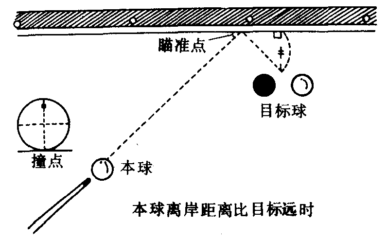 | 释义 | 空岸球杆法台球击球的一种方法。本球先碰岸1次,然后再碰撞第1、第2目标球。它的基本原理是以撞击本球的中心点,使入射角等于反射角。空岸球的基本瞄准方法有两种,第1种情况是本球和目标球离岸距离,处于大致相等的位置,击球的瞄准点是从本球的中心,对着岸边连成直角引线,再从两个目标球中间,对着岸边连成直角引线,将两条线形成的角,找出二等分的点,即是瞄准点。撞击方法可用正中杆、中上杆和中下杆打法。第2种情况是本球的位置离目标球较远,击球的瞄准点是从两个目标球的中央、引出与岸边成直角的线,将该线略向外延长,延长的距离仅限于从目标球的中央,到岸边的距离。然后再将该点与本球的中心连结,这个与岸边相交的点,即是瞄准点。(图2—3—46)撞击方法可用正中杆、中上杆和中下杆打法。应当注意本球碰岸时的入射角不等于反射角,而是多略向前反射。若用强力度撞击,要比用普通力度撞击的反射角大。