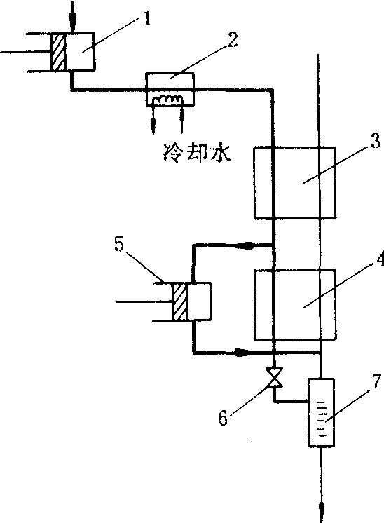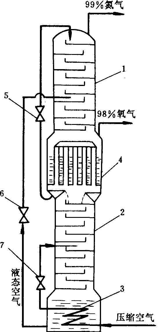 图2为分离空气的双塔式精馏塔。它由上塔和下塔两个塔组成,中间是一个冷凝蒸发器,冷凝蒸发器既是下塔的冷凝器,又是上塔的 蒸发器。操作时,预冷的压缩空气由下塔的塔底进入,通过热交换器降低温度,再经节流阀进入下塔的中部。其中蒸发出来的气体由塔板上升,液体回流下降。气体上升到冷凝蒸发器处所形成的冷凝液一部分作为回流液下降,另一部分导入上塔塔顶作为上塔的回流液。下塔塔底的液态空气导入上塔中部作为上塔进料。由于氮气的沸点比氧气低,因此,随着塔内气-液两相之间质量传递和热量传递的进行,上升气体中氮气的含量越来越高,下降液体中氧气的含量越来越高。最后,由塔顶可得到含量为99%的氮气,由冷凝蒸发器的列管间可导出含量为98%的氧气。空气中的其他组分,因其沸点不同各自在不同的部位浓集,只要在相应的部位抽取馏分,而后加以浓缩和精制,就可得到各种稀有气体。例如,可从上塔中部抽取一部分气体用以提氩;从冷凝蒸发器顶部可收集氦和氖; 氪和氙是空气中沸点最高的组分,最后集中在液氧和气氧中,需进一步从氧气中提取。 |