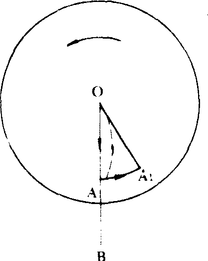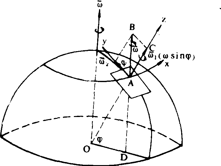 式中ρ是空气密度,△P是两等压面间的气压差,△n是水平面上两等压线间的垂直距离。上式表明水平气压梯度力的大小与气压水平梯度△p/△n成正比,与空气密度ρ成反比。 ❷地转偏向力:空气是在作自转的地球上运动着,当运动的空气质点依其惯性沿着水平气压梯度力的方向运动时,在站在地球表面的观察者看来,空气质点还受到由于地球自转而产生的使空气偏离水平气压梯度力方向的力的作用,这种力称为水平地转偏向力(或科里奥利力)。在大尺度的空气运动中,地转偏向力是一个非常重要的力。为了说明地转偏向力,可以先看一个实验。如图1,取一个圆盘并让它作逆时针旋转,同时取一小球,让它自由地从盘子中心向B点的方向滚去。站在盘外B点处的观察者看到小球沿径线滚来,没有力施加在小球上,路径为直线OA。而在盘内站在A点的观察者看来,由于在小球滚动着的t时间里,A点已转至A1点,因而他看到小球的路径落后了AA1一段距离,仿佛小球时刻受到一个与它运动方向垂直、指向运动方向右侧的力的作用,使它向右方加速运动,以致落后于盘上的观察者了,圆盘上的观察者称这个作用力为偏向力,它使小球的路径发生偏转,走了一条如图中虚线OA所示的曲线路径。显然这个力是由于圆盘的转动和小球的运动引起的。因为在小球沿半径从中心向外运动时,由于圆盘逆时针旋转,小球所到各点线速度向左增加,即都有一个垂直于小球路径而指向小球运动方向之左的加速度,小球在运动中为保持惯性必然会向运动方向的右方加速,在圆盘上的观察者看来,则认为这是小球受到了垂直于小球运动方向而指向运动之右的力的作用的缘故,所以这个力是惯性力,这个力永远与物体(小球)运动的方向垂直。在圆盘作逆时针旋转时,它指向运动方向之右;顺时针旋转时它指向左,而且它只改变物体运动方向而不改变物体运动的速度。地球不停地绕地轴以角速度Ω自西向东自转,在地球的北极和南极处的水平面如同上述圆盘,以Ω角速度旋转着。北极水平面呈逆时针旋转,南极水平面呈顺时针旋转,因而北极空气水平运动受到向右的偏转作用力,南极则受到向左的偏转作用力,这个力就是水平地转偏向力(A),其数值为A=2ΩV。在赤道上,地球自转轴与地表面的垂直轴正交。说明赤道上的地平面不随地球自转而旋转,因而赤道上没有水平地转偏向力。在北半球(或南半球)的其他纬度上,地球自转轴与地平面的垂直轴的交角小于90°,因而任一地的地平面都有绕垂直轴的转动(见图2),其转动的角速度(为绕地轴转动角速度ω在某地平面垂直轴方向的分量)为ωsin 。这样就得出任何纬度上作用于单位质量运动空气上的偏向力:A=2Vωsin 为纬度,V为风速。公式说明:地转偏向力的大小与风速和所在纬度的正弦成正比。即在同一纬度上。风速愈大,偏转力愈大;风速愈小,偏转力愈小;风速为零时,偏转力也为零。在风速相同情况下,偏转力随纬度减小而减小,到赤道时为零,在两极达到最大。