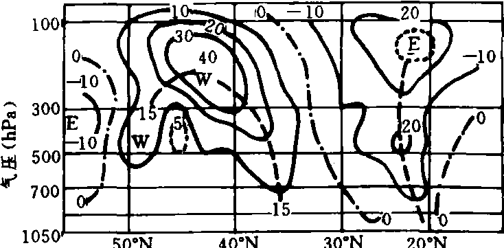 | 释义 | 空间垂直剖面图space vertical crose-section chart分析同一时刻某一垂直面上天气系统结构或大气层结构的图。常取某一水平距离为横坐标,以高度或气压的对数为纵坐标。图中填写不同地点各高度上的气象要素和物理量,主要是气温、比湿、位温、风向、风速、散度、涡度等。视研究目的,通常在一张图上选用1~3个要素或物理量,绘制其等值线,即可了解某要素在某一剖面(如附图中的115°E线)上的空间分布,从而判定锋区位置及其强弱;气流特征和急流位置;对流层顶的位置等。此图能帮助了解大气在某一时刻的空间结构,是天气预报工作中的重要辅助图之一。附图中分析的内容是风向和风速,它表明在35°N以北盛行西风,其中有一急流(W),中心位于200hPa附近,风速约40 m/s;35°N以南盛行东风,东风急流(E)中心位于130 hPa附近,风速比西风要小些。