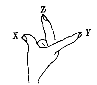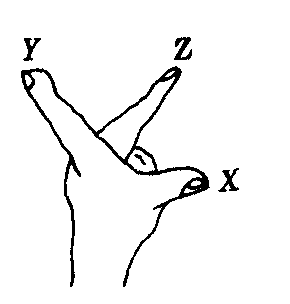 | 释义 | 空间直角坐标系kongjian zhijiao zuobiaoxi在空间任意取一点O,一个长度单位和三条经过点O且两两互相垂直的直线,分别选取它们的正向,使它们成为坐标轴OX,OY,OZ,而且这三个坐标轴顺序的相对位置,就象令右手(或左手)拇指、食指和中指互相垂直时可能形成的相对位置(如图1、图2)就称在空间建立了一个空间直角右手(或左手)坐标系,用OXYZ表示.O点叫做原点,OX,OY,OZ叫做坐标轴.每两条坐标轴确定的平面叫做坐标面.坐标面共有三个,它们两两互相垂直,垂直于OX的叫做YZ面,用OYZ表示;垂直于OY的叫做ZX面,用OZX表示;垂直于OZ的叫做XY面,用OXY表示.