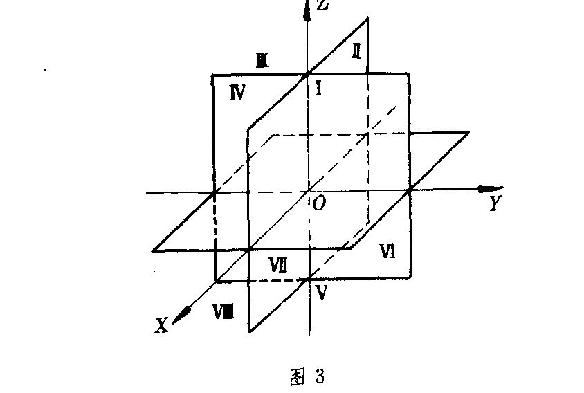 左手系 图2 建立了坐标系之后,对于空间任意点P可按如下确定它的坐标,通过P点作三个平面分别和三个坐标面平行,它们和坐标轴OX,OY,OZ依次交于A,B,C.A点在OX轴上的坐标为x;B点在OY轴上的坐标为y; C点在OZ轴上的坐标为z.这样对空间任意一点P就得到唯一的三元有序实数组,记作(x,y,z).反之,对于任一个三元有序实数组(x,y,z),以x,y,z三个实数依次在坐标轴OX,OY,OZ上确定A,B,C三点,它们在各该轴的坐标依次是x,y,z.经过A,B,C三点依次作平面平行于坐标面OYZ,OZX,OXY,这三个平面两两互相垂直且交于一点P,这样任意一个三元有序实数组可以确定空间唯一的一点和它对应.即空间内的点与三元有序实数组之间建立了一一对应关系.三元有序实数组(x,y,z)叫做点P关于坐标系OXYZ的直角坐标,简称坐标.坐标为(x,y,z)的点P记作P(x,y,z),其中x,y,z分别叫做点P的横坐标(简称横标),纵坐标(简称纵标)和立坐标(简称立标). 在坐标系OXYZ里,YZ面将整个空间分为两个半空间,其中包含X轴正向的一半叫做前半空间,另一半叫做后半空间;XZ面将整个空间分为两个半空间,其中包含Y轴正向的一半叫做右半空间,而另一半叫做左半空间;XY面将整个空间分为两个半空间,其中包含Z轴正向的一半叫做上半空间,而另一半叫做下半空间.三个坐标面把整个空间分成八个部分,每一部分叫做一个卦限,共有八个卦限.坐标面内的点不属于任何卦限.空间的卦限按下列规律编号:同时在前、右、上三个半空间的部分叫做第Ⅰ卦限;同时在后、右、上三个半空间的部分叫做第Ⅱ卦限;同时在后、左、上三个半空间的部分叫做第Ⅲ卦限;同时在前、左、上三个半空间的部分叫做第Ⅳ卦限;在下半空间而位于这四个卦限下面的分别叫做第Ⅴ、第Ⅵ、第Ⅶ、第Ⅷ卦限(如图3).在各卦限内的点的坐标的符号如下表: