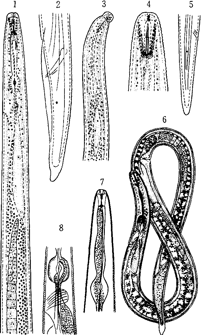 相似穿孔线虫形态图 1.雌虫前部; 2.雄虫尾部; 3.雄虫前部; 4.雌虫头部;5.雌虫尾部; 6.年青雌虫; 7.垫刃总科食道腺开口位置; 8.滑刃总科食道腺开口位置(仿Thorne) 生物学特性 穿孔线虫属迁移性内寄生线虫,侵染植物根部,在根的皮层内完成生活史。相似穿孔线虫在短萼灰毛豆(Tephrosia candida)上在24~32℃下从卵到卵完成生活史共需20~25天。产卵后8~10天孵化,完成幼虫发育阶段需10~13天。柑桔穿孔线虫在柑橘上在24~27℃下完成生活史需18~20天。雌虫和各龄幼虫均能侵染,线虫侵入根后,在皮层薄壁细胞间从附近细胞的原生质中取食,不侵染中柱。受侵部位根腐烂后,由于营养需要,线虫转移到健康组织中取食和产卵,转移所穿刺的地方形成坏死坑道,从而引起根进一步腐烂。由于根部腐烂,地上部出现黄化、衰退等症状。在胡椒上表现为黄化和顶枯,叶子逐渐黄化,特别嫩叶更明显,植株生长停滞,叶下垂,顶部枯死,最后整株死亡。在柑橘上,病株叶少而小,枯死叶成倍增加,叶片容易凋萎; 新梢衰弱,老枝梢末端叶子落尽,最后枯死; 病株着果率低,常常只有几个成熟果挂在树上,产量很低。一般情况下,病株不会整株死亡。穿孔线虫通过带病的植物材料如香蕉的吸芽,柑桔等作物的病苗木作远距离传播,近距离通过流水、人畜活动,农事操作等传播。在没有寄主根和新鲜的球茎碎片存在的情况下,相似穿孔线虫在土壤中存活不超过6个月。 主要病原线虫 穿孔线虫属1987年法国卢卡(M.Luc)报道有26个有效种,随后,1989年日本报道发生的一个新种萨诺穿孔线虫,因此,此属共有27个有效种。其中为害普遍而严重的主要是相似穿孔线虫〔R.similis (Cobb)Thorne〕和柑橘穿孔线虫(R.cit-riphilus Huettel,Dickson & Kaplan)。 控制 穿孔线虫是中国的对外检疫对象之一,要严格执行检疫措施。严禁从疫区进口香蕉、胡椒及柑桔等栽植材料。如需少量幼苗作科研用,则应用附有检疫证书的栽植材料,如为香蕉,应用试管苗,并在严格隔离条件下试种观察2年以上,经反复检验确认无病后,才能扩大栽培。如一旦传入,应马上采取严密封锁和彻底铲除措施。 当前各国控制穿孔线虫病所普遍采用的措施是种植有检疫证书及经卫生处理的无病材料以防止线虫扩散蔓延; 选育有抗性的种植材料; 轮栽或间种抗性作物如万寿菊、苜蓿,豆科绿肥,甘薯或牧草等作物; 休闲; 水淹病土; 物理方法处理带病材料; 施用化学药剂呋喃丹,克线磷(fenamiphos)和涕灭威(aldicarb)等杀虫,杀线剂作土壤消毒、病株处理或浸泡有病种植材料均能明显降低线虫数量、增加产量。 穿孔线虫属Radopholus垫刃目。两性虫体,长0.4~0.9mm,前部形态有明显区别。雄虫唇高,圆,缢缩,唇架不发达,口针及食道退化。雌虫唇低,较平,不缢缩或微缢缩,唇架重角化。侧带区刻线3~7条。食道垫刃型,食道腺叶状,从背面覆盖肠端。雌虫双向双生殖管,伸展,阴门常在55%~65%体长处,受精囊内有精子,多为杆状,极少圆形。尾感器多于前1/3尾区。雌尾长圆锥形至亚圆筒状,交合刺有刺头,微弯。交合伞包裹至尾尖或近尾尖。引带可伸缩。本属现有20多种,为根系迁移性内寄生物,取食皮层薄壁细胞,在根内引起腔隙及隧道病变。穿孔线虫大多数发生于新西兰和澳大利亚。少数如相似穿孔线虫〔Radopholus similis (Cobb) Thorne〕广布于世界香蕉产区,尼日利亚穿孔线虫(R.nigeriensis Sher)、柑橘穿孔线虫(R.citrophilus Huettel et al.)及桑诺穿孔线虫(R.sanoi Mizukubo)则分别在非洲、美国及日本发生。相似穿孔线虫和柑橘穿孔线虫都是重要的植物病原线虫。 |