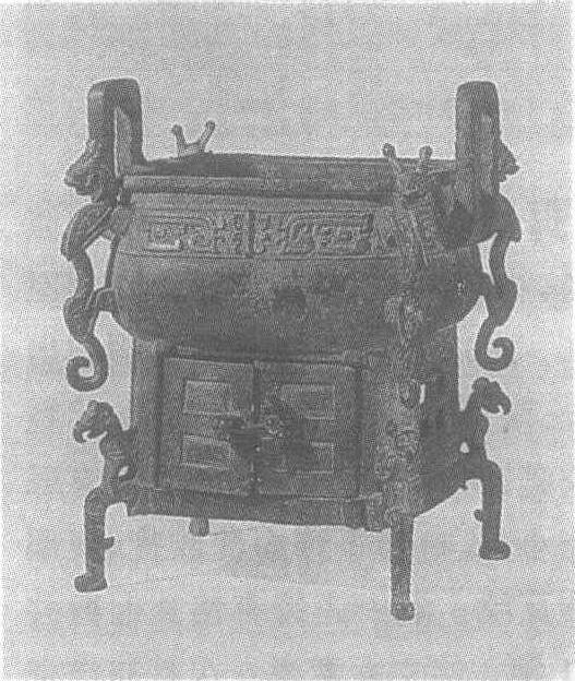 | 释义 | 窃曲纹铜方鬲西周。古代炊器。通高17.7厘米,口横11.9厘米,口纵9.2厘米,腹深6.3厘米。重1.6公斤。1976年陕西省扶风庄白村出土。陕西周原扶风文管所藏。此鬲呈长方形体,分上下两部分,上为器身,下为底座,器身四角略圆,下腹微鼓。双腹耳,四隅各铸一龙。口沿下饰云纹衬地的窃曲纹。下部器座为灶,正面开门,有可启闭的双扇门。右边的一扇门上,铸一浮雕人,无足。在刖刑奴隶的腹部插一铜棍作为门闩。在另一扇门的对应处铸一兽头状的粗环钮,门闩可插入。灶两侧各有四个长方形孔窗,背面饰镂空窃曲纹。灶的四角下部铸怪兽为足。灶内可燃木炭以温鼎内食物。此器造型优美,设计颇俱匠心,是西周中期不可多得的艺术佳作。北京故宫博物馆收藏一鬲,与此器相似。