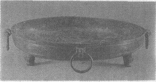 春秋。通高9.4厘米,口径39厘米。1978年河南省淅川县下寺1号楚墓出土。河南省博物馆藏。此盘四个环形耳,饕餮纹膝,三蹄足。盘腹部饰窃曲纹。这种器形在河南南部出土铜器中常见。
