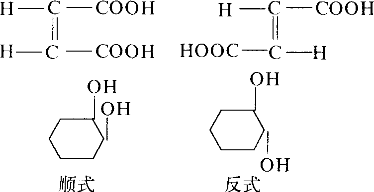 除碳原子外,硅、锗、锡、氮、磷、砷、锑、硫、硒、碲等元素的化合物,也具有光学异构现象。此外,除上由于中心型手性引起的光学异构现象外,轴型手性分子、面型手性分子,也具有光学异构现象。 光学异构体的对映体,具有完全相反的旋光性质和相同的物理化学性质;非对映体则具有相似的化学性质和不同的物理性质。具有生物活性的光学异构体,其活性大小往往很不一样,一般只有其中的一个光学异构体,具有最大的生物活性。要获得最有效的光学异构体,须采用如拆分、不对称合成等特殊的方法。 顺反异构 在双键或环状化合物中,由于原子或取代基彼此在双键或双骨架平面的同侧或异侧而引起的立体异构。顺反异构体中的两个原子或原子团间相对距离不同。例如,丁烯二酸,有两种不同的空间排列: 相同原子或原子团在双键同侧的叫顺式异构体,在异侧的叫反式异构体。又如1,2-环己二醇也有不同的空间排列: 羟基在环一侧的为顺式异构体,在环两侧的为反式异构体(图2)。