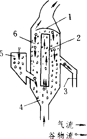 立筒式气流干燥室 1.挡板 2.导向管 3.卸料闸门 4.干燥室 5.进料斗 6.环带区 |