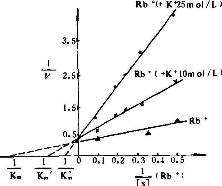 收速率;S为外部溶液中的离子浓度;Km为米氏常数。表达离子与载体亲和力的关系,按酶促反应动力学方程定义,Km值越大,亲和力越小,反之则大。用1/[S]对1/v作图,可得一直线,纵轴截距为1/V,斜率为Km/V,其外延线与横轴的交点为|1/Km|,由此可获得V和Km值。加入另一离子后,观测原有离子的V和Km值,即可判别离子间是否存在竞争性抑制。 爱普斯坦和C.E.哈根(Hagen)把大麦根吸收Rb+速率的倒数1/v,和Rb+浓度的倒数1/[S]作图,得到直线(1),其外延线与横轴的交点为|1/Km|。当Rb+溶液中加入K+后,再测Rb+的1/v和1/[S],得直线(2)和(3),各自外延线与横轴的交点为|1/Km′|和|1/Km″|(图)。结果表明,当加入K+后,Rb+的Km由小变大,Vmax值几乎不变,说明Rb+ 与K+之间存在竞争性抑制。