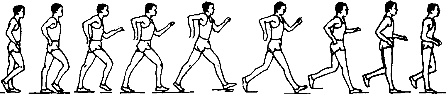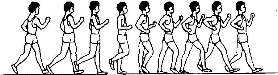 竞走Jingzou走是人体最基本的活动方式之一。竞走则是在普通走的基础上发展的田径运动竞赛项目之一。其特点是与地面保持不间断接触地向前跨步走。 竞走运动于19世纪初在英国出现,并在欧洲一些国家流行。1908年第4届奥运会上被列为比赛项目。1979年第9届竞走世界杯赛上,女子5公里竞走首次进行了比赛。目前,国际上正式比赛的项目有公路竞走赛:女子5公里和10公里;男子20公里和50公里。场地竞走赛:女子5 000米和10 000米;男子10 000米和20 000米。场地竞走赛设有世界纪录,公路竞走赛只有世界最好成绩。 20世纪初竞走运动传入中国。1956年举行了第1次全国竞走比赛,在以后的田径运动会上皆设有竞走项目,竞走运动已得到普及开展。1982年始举行女子竞走比赛。中国运动员在竞走项目上取得了好成绩,尤其是女运动员成绩更为突出。 练习竞走能发展耐力,培养吃苦耐劳、不怕困难的意志品质。能增强腿部力量,提高髋关节的灵活性和动作的协调性,改善内脏器官的功能。竞走练习便于广泛开展,它不受年龄、性别、场地、器材、气候等条件的限制。现代竞走技术的特点是:动作自然,步幅大,频率快,摆臂有力,节奏感强,骨盆的转动主要是绕身体纵轴运动,身体位移直线性好。 动作要领 ❶上体基本正直,眼看前方。 ❷两臂屈肘约成90°前后摆动,肩关节放松。 ❸身体处于垂直部位时,支撑腿膝部不弯屈。 ❹身体重心移过支撑点后蹬时,摆动腿迅速屈膝前摆,大腿不高抬,小腿顺惯性前伸,在后脚离地之前迅速用脚跟着地,形成短暂的双脚支撑。 ❺已着地的摆动腿快速由脚跟滚动至全脚掌,同时蹬离地面后的支撑腿前摆,身体前移至垂直部位。 ❻两脚着地点接近一条直线,身体重心较平稳地前移。 教学重点 ❶掌握竞走的腿部动作,体会骨盆绕身体纵轴转动。采取在普通走基础上逐步过渡到竞走的练习方法,体会骨盆的转动与两腿的迈步配合。 ❷掌握摆臂动作。可采用原地摆臂练习,原地摆臂到慢步走的练习等,体会摆臂时肩部、上体的配合动作。在慢速、中速、变速、弯道竞走中体会上、下肢以及骨盆的配合动作。