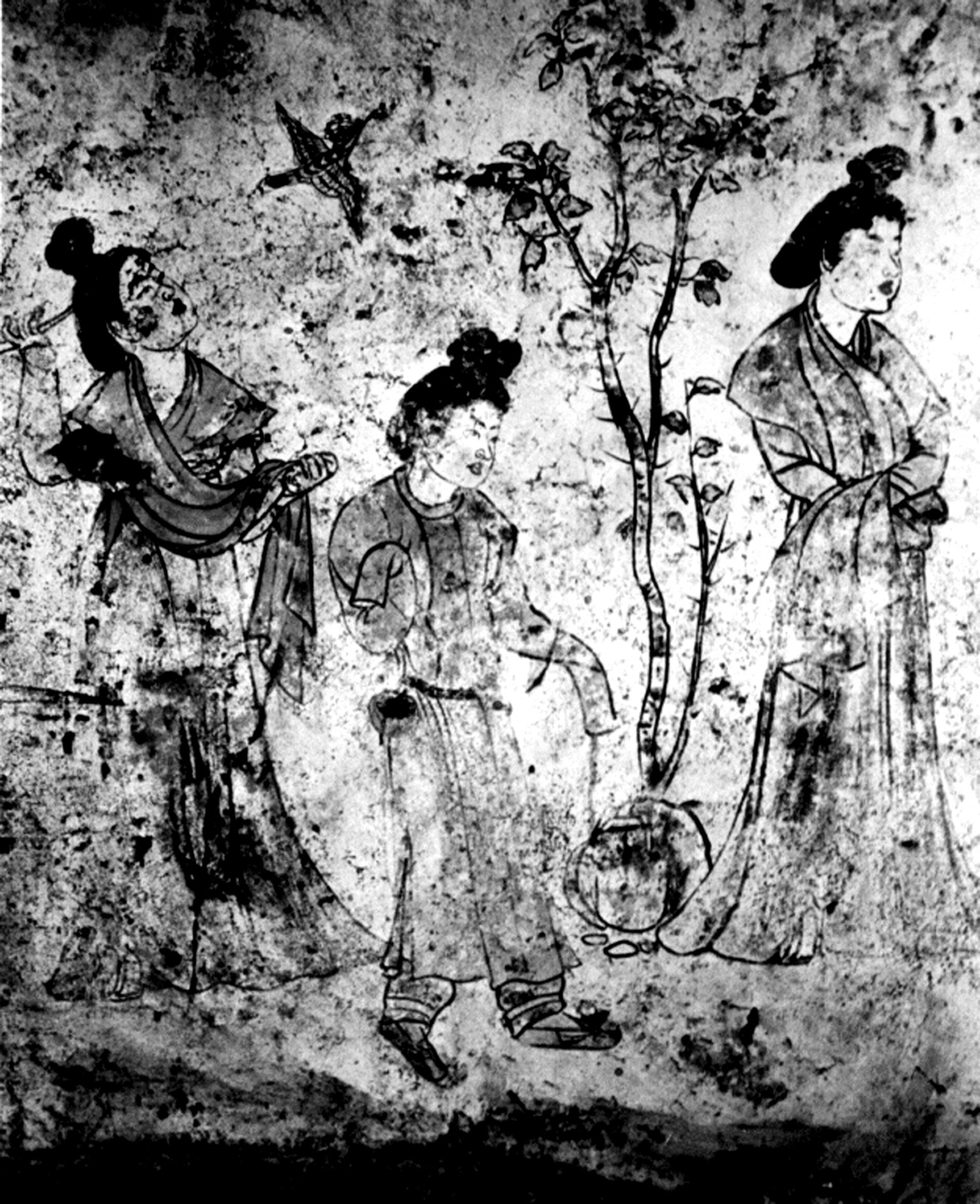 | 释义 | 章怀太子墓壁画观鸟捕蝉图zhɑnɡhuɑitɑizi mu bihuɑ ɡuɑnniɑo buchɑn tu1971年乾县唐章怀太子李贤墓出土。位于墓前室西壁南侧,高168厘米,宽175厘米。绘三位宫女。左一宫女肩披红巾,一手抚头钗,一手托巾,抬头仰视空中飞鸟。中央宫女身着圆领窄袖黄色长袍,凝视树上鸣蝉,举手欲扑。右一宫女头梳高髻,丰眉朱唇,身着黄色衣裙,双手托披巾于胸前,凝神前望,若有所思。现藏陕西历史博物馆。