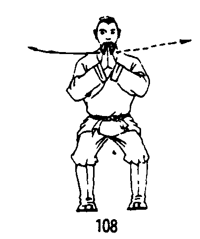 | 释义 | 童子拜佛四十九式经络动功第3段“导气”动作之三(全套动作顺序第二十五式):两手从两颊合于面前,掌指朝上,中指端与鼻尖齐平,掌距面部约30厘米;同时两腿半蹲;意想着自己置身于一座苍松环抱,翠竹成林,祥光霭霭,云雾纷纷的古刹之中,整个身体就像霞光飘渺,香烟缭绕一样的飘浮着,飘向天边,飘向云层,飘向太空,飘向月宫。(图108)要求:下肢稳固,上体中正,松腰敛臀,两眼轻闭或平视。