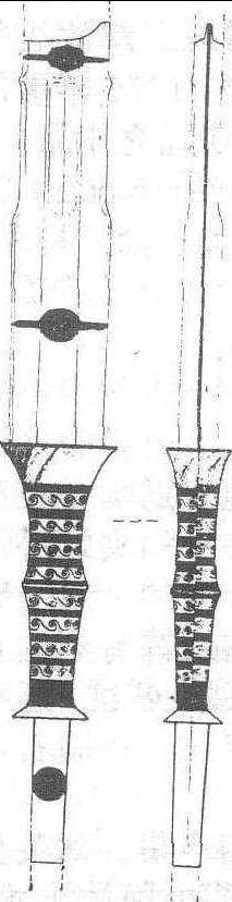 | 释义 | 竹节式柄铜剑战国末至两汉初兵器。1982年在吉林省舒兰县溪河乡征集。现藏吉林市博物馆。此剑为青铜质地合范铸造。剑身呈八棱形,中脊后部成椭圆形,剑叶扁薄,两刃锋利。剑身中部之前已残断不存。剑茎呈椭圆形竹节状,面饰以条带纹和卷云纹。剑格及茎端双角外层呈喇叭状,面饰放射状细弧线纹。茎后下连一圆柱体,末端稍残。全剑除局部有铜斑外,大部乌亮,可知其中含锡比重较大。剑残长29.9厘米,其中剑身长15.1、柄长14.8、茎后圆柱长5.2厘米、格宽4.2厘米。