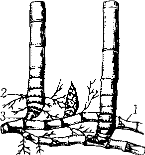 竹蔸 1.竹鞭 2. 秆基 3.秆柄 |