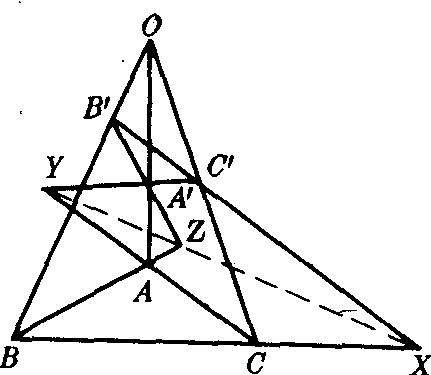 如图,若△ABC与△A′B′C′中,AA′,BB′,CC′三直线交于一点O,X,Y,Z分别为直线BC和B′C′,CA和C′A′,BA和B′A′的交点,则X,Y,Z三点共线. 在△OBC中,根据