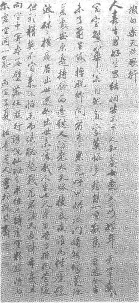 | 释义 | 笪重光行书拟白居易放歌行清。纸本。纵84厘米,横42.6厘米。北京故宫博物院藏。笪重光(明天启三年—清康熙三十一年,即公元1623—1692年),字在辛,号君宜、蟾光、逸叟、江上外史,江苏镇江人。顺治间进士。官御史。工山水兰竹。精鉴赏。书法师苏轼、米芾,名重一时,与姜宸英、汪士鋐、何焯称“四大家”。此件作品,行书拟白居易《放歌行》所作,书于“丙寅孟夏”(康熙二十五年,公元1686年)属晚年书迹。其超逸之致,多承苏氏遗意,且寓晋唐楷法于其中,极见功力。
