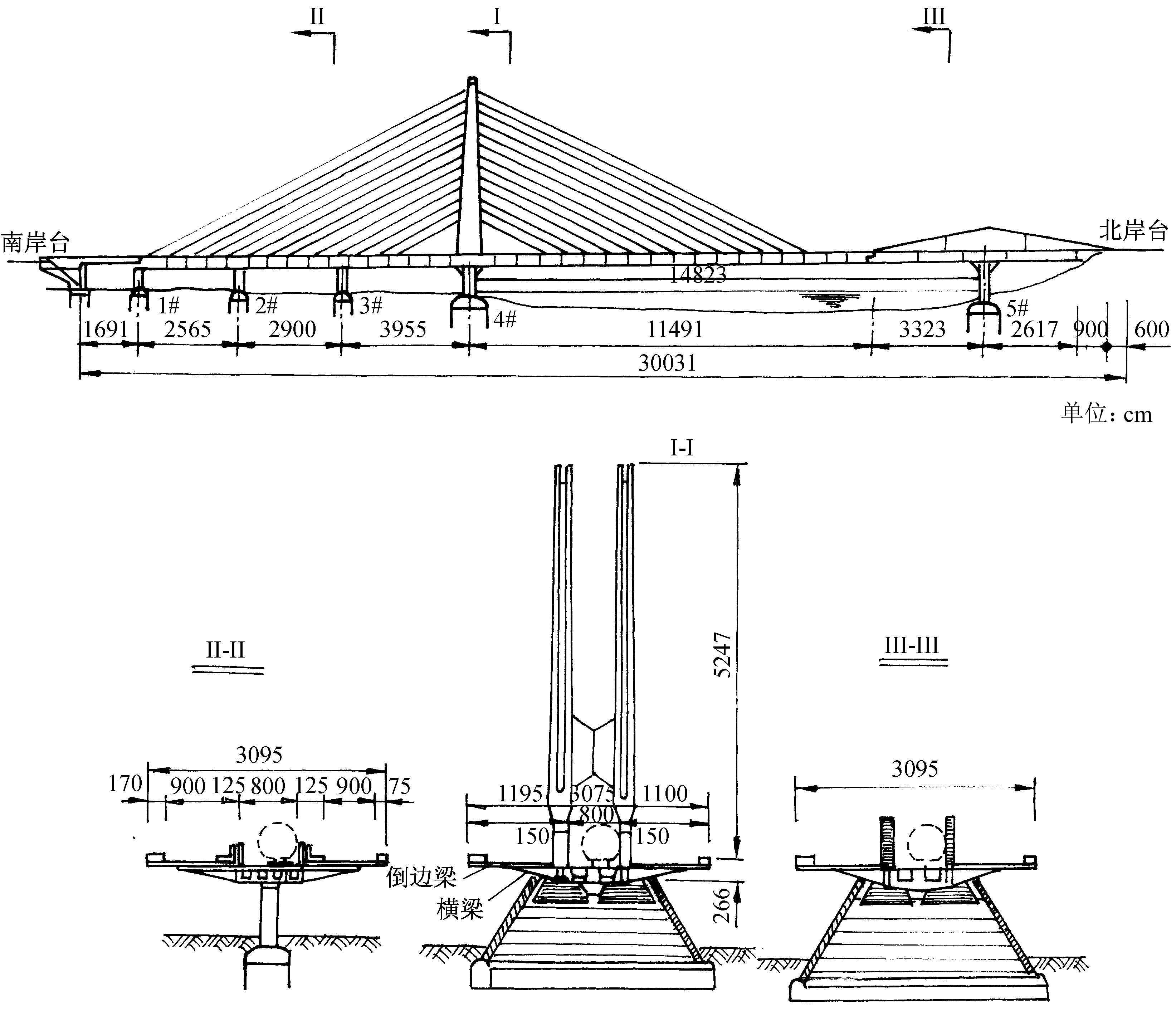 | 释义 | 第二美茵河桥Second Main Bridge德国跨越美茵河的铁路、公路、管道三用桥(见下图)。位于法兰克福,1972年建成。全长300.31m,正桥为主孔跨度148.23m的独塔不对称预应力混凝土斜拉桥。H形钢筋混凝土桥塔在桥面以上高52.47m,塔梁墩固结。预应力混凝土加劲梁采用高度为2.66m,宽度为8.0m的箱形截面,两侧各有11.00m和11.95m的伸臂。桥面全宽30.95m,铁路和管道设于桥的中央,两侧各有宽度为9.0m的三车道公路。竖琴式斜拉索有13对索,主跨上拉索中距6.3m,锚跨上为5.8m,每根斜拉索由25根直径16mm的高强预应力螺纹钢筋组成,采用迪维达克张拉锚固体系。所有拉索的钢筋都套在直径193.7mm、壁厚54mm的空心钢管内。加劲梁用悬臂浇筑法施工。主跨加劲梁的末端支承在此岸悬臂梁33.32m的伸臂末端。
