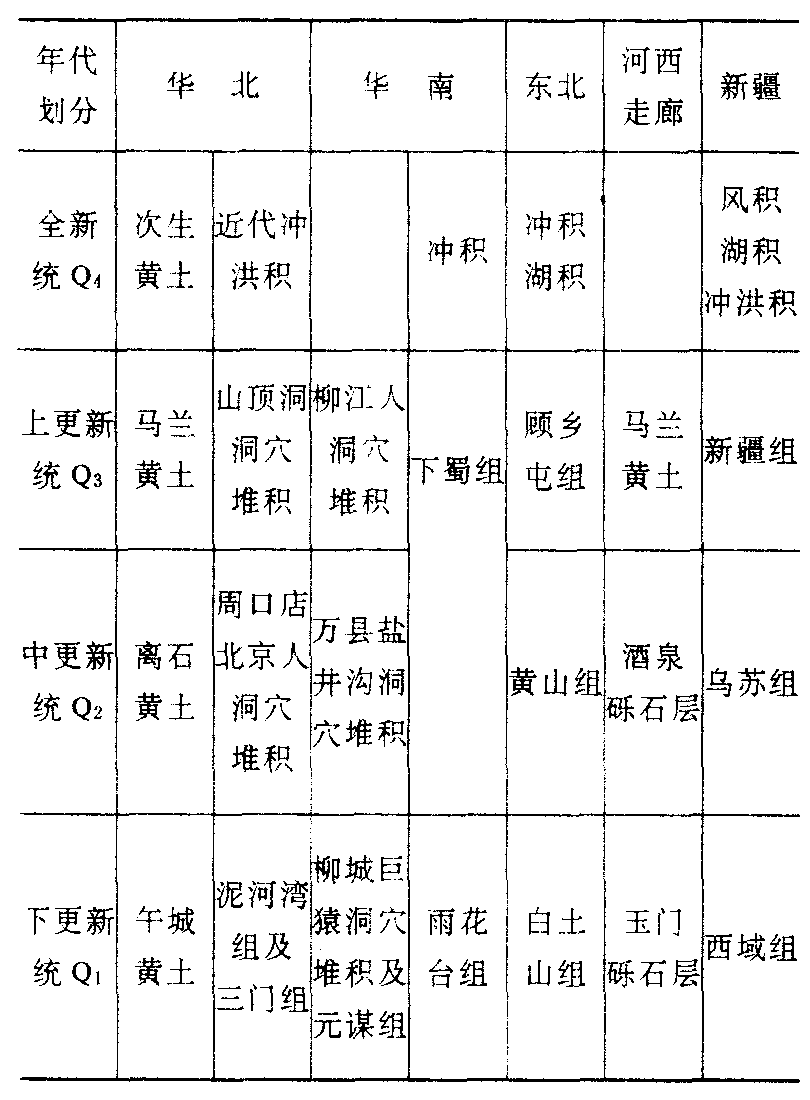 黄土堆积是第四纪的重要特征之一,是第四纪时在特定环境下形成的一种粉砂性(含亚砂、亚粘)、多钙性、多孔隙和多垂直节理的松散土状堆积,粒级为0.05~0.001毫米,组成矿物成分有石英、长石和未分解的角闪石、辉石、黑云母等碎屑,有时含哺乳动物和蜗牛等化石。原生黄土一般没有明显层理。主要分布于甘、陕、晋、宁、豫、内蒙、冀等省区。我国是世界上黄土发育最好和分布面积最广的国家。一般认为原生黄土是由风力搬运堆积而成的。其根据是:黄土无层理;矿物颗粒多棱角;含有未分解的角闪石、辉石、黑云母等暗色矿物(反映干燥气候条件,因在潮湿气候条件下这些矿物极易分解);黄土颗粒和黄土厚度自西而东和自北而南有逐渐变小的趋势(说明黄土颗粒是由西北风吹来);黄土可以覆盖在高低不同的地面上,黄土地形常和被其覆盖的基岩地形基本一致(只有风力搬运才能铺天盖顶进行堆积);黄土中常发现鸵鸟蛋、蜗牛等干燥区动物化石。有些黄土是经过流水、洪水等再搬运而沉积的,称“次生黄土”。黄土在整个第四纪都有堆积,根据山西等地黄土剖面,可以划分为午城黄土(Q1),黄红色;离石黄土(Q2),淡棕色;马兰黄土(Q3),黄灰色。以上午城黄土和离石黄土中夹有多层棕红色条带,即埋藏土壤。下表为中国第四系对比简表。