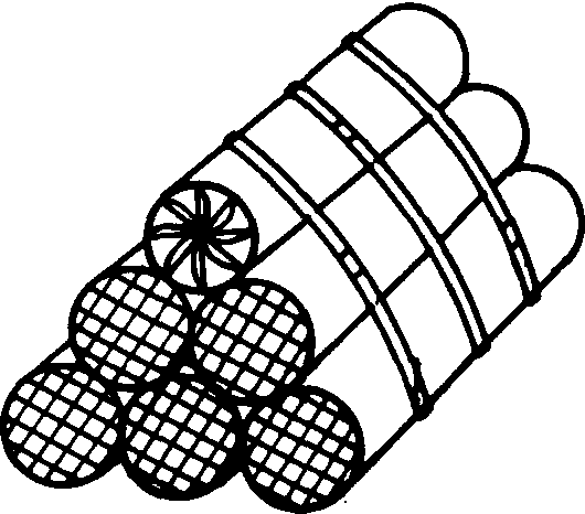 图1 运输时扎成捆的筒式蜂笼捆的上方,口径较小的是塑料鳍片塞;捆的下部,口径较大的是金属环塞