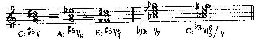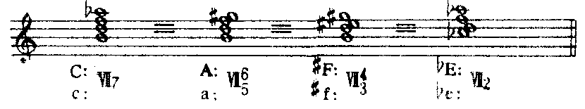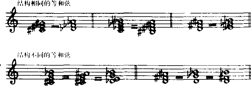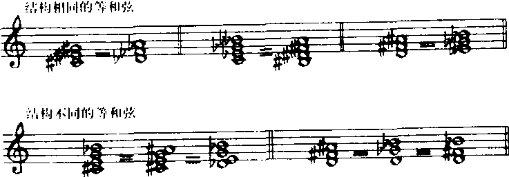 | 释义 | 等和弦在十二平均律中,利用等音变换方式记谱,从而使实际音响相同,但内部结构不同,因而其所属的调性和作用也不相同的和弦,称为等和弦。在等和弦中,等音的变换可以是一个音,也可以是几个音。在音乐创作中,主要利用等音变换后音的倾向关系的改变实现转调。各种自然和弦、半音和弦与变音和弦均可作等和弦变换。其中,常见的有如下几种:❶减七和弦的等换。利用其中的小3度与增2度为等音程,可以将一个减七和弦记成四种形式。 等和弦Deng hexian孤立地听时音响相同,但在乐曲中意义不同,音名及写法也不同的两个和弦。等和弦有两类。结构相同的等和弦是由等音调而形成的。