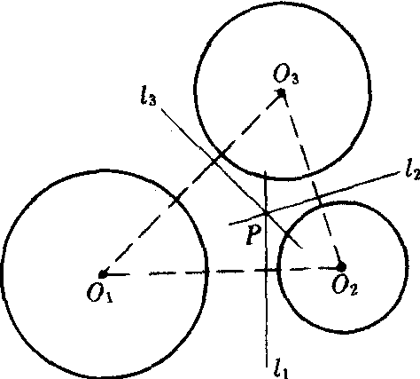 圆心不共线的三个圆的三条等幂轴的交点.如图,l1,l2,l3分别是其中两圆的等幂轴.l1,l2,l3必共点,P是l1,l2,l3的交点,因此P是这三个圆的等幂心.