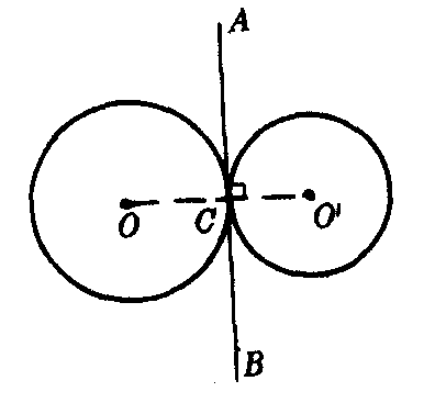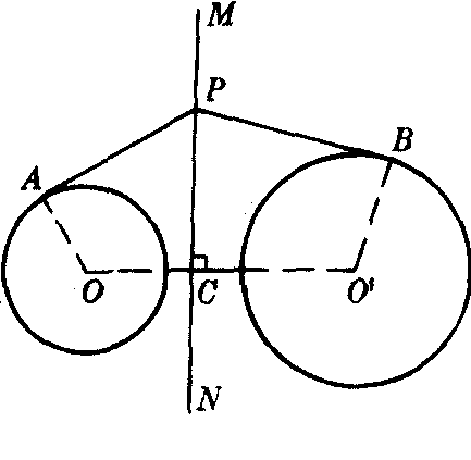 图3 ❷相切两圆的等幂轴是过切点的公切线.如图2,⊙O,⊙O′切于C,过C点两圆的公切线AB(过切点垂直于连心线OO′)是它们的等幂轴; ❸没有公共点的两圆的等幂轴是过P点且垂直于连心线的一条直线,P点到⊙O,⊙O′的切线长相等.如图3. |