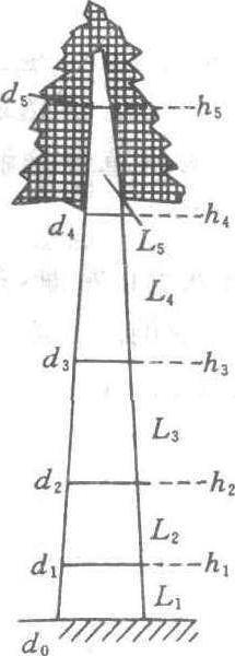 | 释义 | 等直径差区分求积法height accumulation method又称累高法。内业计算立木材积实测方法。该法是按照树干递减直径的等差级数对树干进行区分(如图),即要求各区分段大头直径与小头直径的差值相等(直径差值可取2、3、4 cm等),并测得不等长区分段的长度,梢头材积忽略不计。其计算树干材积式为: