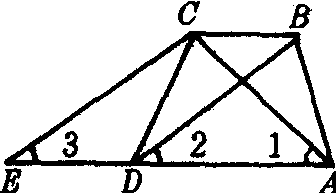 ❷若梯形的两条对角线相等,则这个梯形是等腰梯形.证明这个定理,可以用图中所示方法,作CE∥BD交AD延长线于E,由∠3=∠2,∠3=∠1,推知∠1=∠2.证△ABD≌△DCA.AB=DC. |