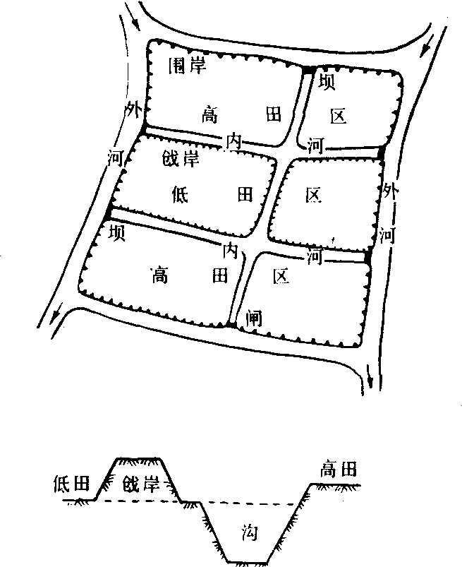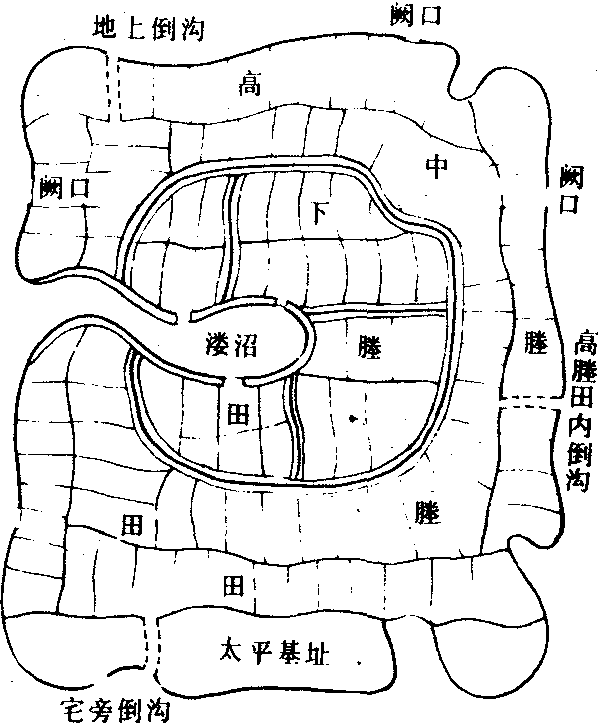 塍田”和“下塍田”三级,使各级农田自成独立的区段,区段内又作小塍岸,分成若干格,通过分级、分区、分格控制,实行内外分开,高低分排。在圩堤外围开缺口设堰闸排上塍水;从上塍内开挖“倒沟”排中塍水;在圩内低洼处开凿溇沼通外河排下塍水(见图1)。