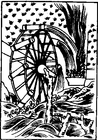 | 释义 | 071 筒车中国大约在唐代发明了一种新型的灌溉工具——筒车。这种灌溉工具是由竹或木制成一个大型立轮,轮的大小以岸高为准,要求轮高于岸,用一个横轴将轮架起,轮的周围斜装上若干小木筒或小竹筒。将这种筒车安装在水边,立轮的下部浸入水中,水流冲击立轮转动,轮周的小筒就川流不息地依次汲水到岸上的木槽中,供农田灌溉之用。这是水转筒车,及至元代又发明了畜力筒车及高转筒车。 筒车a kind of water wheel pump古代利用水流为动力自动提取河水的灌溉机械。筒车是用木材制成大型立轮,由一横轴架起。轮的周围斜装若干小竹筒(亦有用木筒),轮的下部有一部分浸入水中,流水冲击轮周围的栏板转动立轮,就将装满水的小筒转到上部自动泻入木槽,流到田里灌溉(见图)。