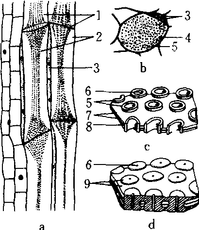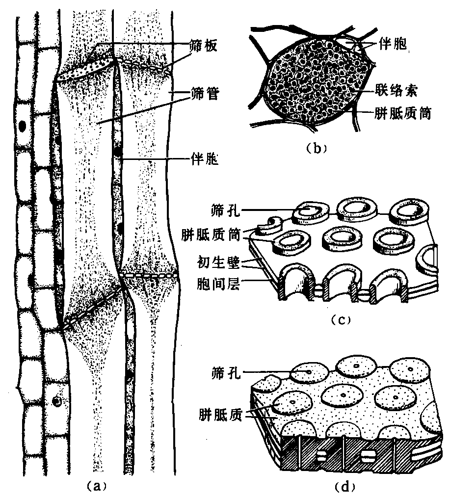 筛管分子和伴胞 a.筛管和伴胞纵切面 b. 筛管和伴胞横切面 c. 筛孔周围沉积胼胝质 d. 筛孔周围和筛板上继续沉积胼胝质 1.筛板 2. 筛管 3.伴胞 4. 联络索 5. 胼胝质筒 6. 筛孔 7. 初生壁 8.胞间层 9. 胼胝质 |