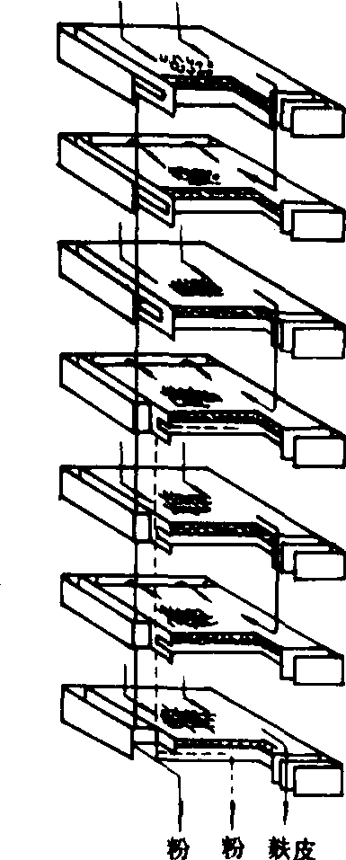 图1 单体小方筛筛格与筛路示意图 高方平筛 因筛格呈正方形,筛体较高而得名。筛体用4组藤条或玻璃纤维条或钢丝绳水平悬吊起来,并由电动机驱动带偏心重块的传动装置,驱动筛体作平面回转运动。筛体内封装有二、四、六、八幢方筛,每幢叠装16~24格筛格。根据工艺要求,一种物料可以使用半幢或几幅筛格。每层筛格下面放置橡皮球、帆布块或塑料块,用以清理筛面。其优点是:每平方米筛理面积占地少,约为0.15~0.16米2(挑担平筛为0.2米2);筛格小,重量轻,检修拆装方便;筛格的通用互换性好,只要型号相同,可调换使用;改变面粉品种时,调整筛路和筛格容易;产量大;筛理效率高。 挑担平筛 用钢制大梁联结左右筛体,形如挑担。挑担平筛单位产量占地面积比单体小方筛小,运转比较平稳。传动形式有主轴传动和无主轴传动两种。 平筛的转速一般采用以下公式进行计算: