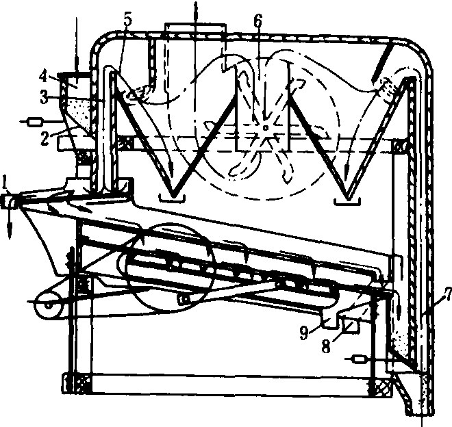 图1 振动筛的工作过程 1.大杂出口; 2.压力门; 3.进口吸风道; 4.进料斗;5.风量调节活门; 6.风机; 7.出口风道; 8.中杂出口;9.小杂出口 类型与结构 常用的筛选设备有振动筛、高速振动筛、平面回转筛、筒筛和溜筛。 振动筛 筛面作往复运动的一种筛选设备,常与风选相结合。它是粮食加工厂中普遍使用的一种清理设备,通常放在初清筛后面,用以清除粮食中的大、小杂质和轻杂质。振动筛主要由进料斗、筛体、吸风装置和振动机构等部分组成。典型的振动筛结构和工作过程如图1所示,筛体传动有曲柄连杆机构和自衡振动机构两种形式。振动筛工作时, 粮粒由进料斗经压力门均匀分布于筛面,经过前吸风道吸去轻杂质及灰尘然后进入第一层筛面,未通过筛孔的大杂由出口排出。穿过筛孔的物料继续由第二层筛面筛理, 从第二层筛面上分离出中杂, 由出口排出; 粮粒由第三层筛面上排出, 经后吸风道再次吸出轻杂。第三层筛下的小杂, 沿底板下滑至出口排出。由风道吸出的轻杂经活门进入沉降室, 当积聚到一定重量后, 自动压开活门排出机外。 由于振动筛的筛面是作往复运动的,物料颗粒在沿筛面作上下相对滑动的过程中穿过筛孔,得到分离,所以筛面振动频率不能过快,以免物料跳离筛面,减少与筛面接触的机会,降低筛理效果。振动筛的筛面倾角一般为5°~10°,筛架主轴转速为450~650转/分,振幅为5~6毫米左右。 高速振动筛 筛体振动频率较高而振幅较小的一种筛选设备。主要由进料装置、筛体及振动器、吸风装置及传动等部分组成。筛体分主筛和副筛,主筛有一层大杂筛面和两层小杂筛面,副筛装在主筛出料端底板下方,使小杂筛面的筛下物得以继续清理。整个筛体由4组刚度相等的螺旋弹簧支承在机架上。筛体振幅为1.5~2毫米, 振动器主轴转速为1 400~1 500转/分,筛体在垂直面作近似的圆形运动,筛面上的物料是在沿筛面跳跃翻滚的状态下进行分选的,所以筛孔不易堵塞。用于粮食加工厂的稻谷除稗和清除小麦杂质等作业。