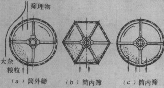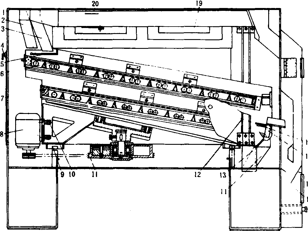 图2 平面回转筛 1.机架; 2.吸风管道; 3.进料斗; 4.检修门; 5.缓冲淌板; 6.上层筛面; 7.下层筛面;8.电动机; 9.调节螺栓; 10.限振装置; 11.传动轮; 12.吊杆; 13.小杂管; 14.大杂管;15.出料口; 16.检查窗; 17.平衡重块; 18.把手; 19.观察窗; 20.调风门 筛体振动由安装在传动轴两端的可移式自动平衡振动器产生。当传动轴转动时,振动器内安装的偏心重块甩开,产生离心惯性力,使筛体作高速振动。此外,这种振动器还可消除筛体在启动及停车过程中的共振现象。电机启动时,由于传动轴转速较低,偏心重块没有甩开,对筛体不产生激振力。当传动轴转速超过筛体共振转速区后,偏心重块的离心力矩克服了其拉力弹簧的拉力矩后而向外甩开,达到正常工作状态,产生激振力,使筛体高速振动。同理,机器停车时,也可以消除筛体的共振。 平面回转筛 筛面作水平回转运动的一种筛选设备。它是物料相对于筛面作近似摆线的下滑运动,而实现物料与杂质的分离。物料在回转筛面上的筛理流程较长,筛选效率较高,除杂效果好。通常用于粮食清理的平面回转筛,只有两层略带倾斜的筛面,其筛面倾角为8°,筛面回转直径为14毫米,转速400转/分。以分离粮食中的大、小杂质;轻杂质由吸风装置分离。 平面回转筛的结构如图2。粮食从进料口进入上层筛面,大杂、轻杂通过筛面流入大杂出口,粮食及小杂穿过筛孔进入下筛。粮食经过下筛筛面从出口排出,再经过一次风选;小杂穿过下筛筛孔从小杂出口排出。 筒筛 筛筒作等速旋转运动的一种筛选设备。筒筛的筛面呈圆筒形或六角形(图3)。筛筒与水平面呈3°~10°倾角,筛面多为金属丝编织的方孔筛网。筒筛按用途分筒外筛理和筒内筛理两种筛理方式。筒外筛理时,筛理物落在筒筛的外表面上,粮粒穿过筛孔下落,大杂则沿筒筛表面下滑而分离;筒内筛理时,筛理物进入筛筒,粮粒穿过筛孔下落,大杂则留在筒内,随筛筒旋转而排出。筒筛通常都配有吸风装置。在大型粮食和饲料加工厂里筒筛用作除去粮食中大杂和轻杂的初步清理设备。筒筛工作时应使物料产生的离心力小于其自身的重力,所以其转速不能过快,一般为10~25转/分。