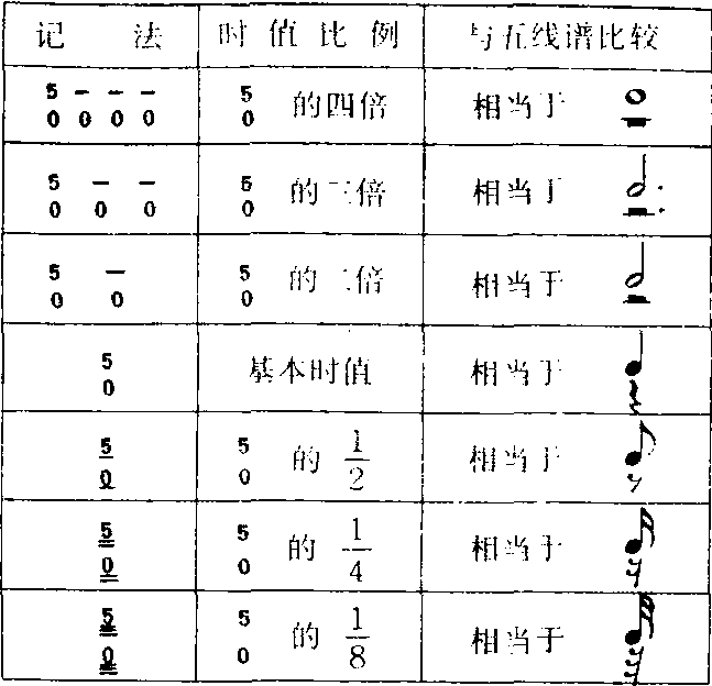 简谱中音的时值是用不加任何标记的数字 (代表唱名的)表示基本时值,相当于五线谱中的四分音符,增长时值时按时值比例在数字后加“—”(短横线)每增加一道短横线即增加一个基本时值; 减短时值时按时值比例在数字下面加“一”(短横线)每增加一道短横线即递减1/2时值,如5为基本时值的1/2,5减短5的1/2,(即该音的时值为基本时值的1/4)。见下表: 休止符增长时值时,习惯上不用短横线而加用相应数目的 “0”表示。见下表: 在数字右侧加“·”称附点,带有附点的音符称附点音符。附点表示增长其左侧的音符或符点时值的二分之一。各音如需临时升降变化,则在数字的左上侧加上升(#)降(b)记号,例如#4和b7等。比七个调式音级更高或更低的音,需在数字上方或下方加写高音点或低音点。以5为例:低一个八度为5;低两个八度为5;高一个八度写为5; 高两个八度写为5。拍号用一短斜线(或横线)将两个阿拉伯数字分开,如2/4,上方的数字表示每小节有几拍,下方的数字表示以几分音符为一拍。关于调的高低的标记法,现有二种方法并存:❶标出主音的确定高度,标明于曲首拍号之前。例如:1=bB即曲中1(do)为主音,确定高度为bB音,其余音级的音高依次确定。又如:6=C,即曲中6(La)为主音,确定高度为C音。 ❷不论何种调式,一律只标记出 “1”音的高度。