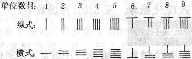 | 释义 | 010 算筹记数利用算筹表示数目的方法。算筹记数不用位值符号,而采用地位制。其肇始年代已不可详考,至迟在公元前5世纪的春秋战国时期已相当完备。用算筹表示单位数目,分纵式与横式两种。其摆法为: