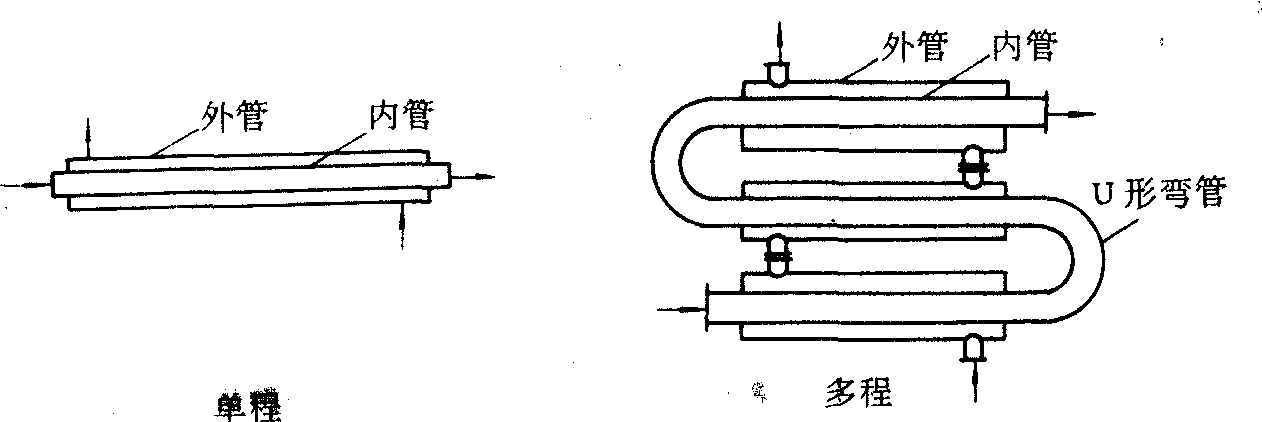 图2 套管式热交换器 不同类型的管式热交换器各有优缺点,在目前的化学工业中都有应用,关键是根据实际需要因地制宜,用其所长。