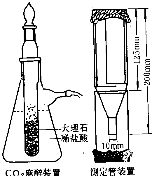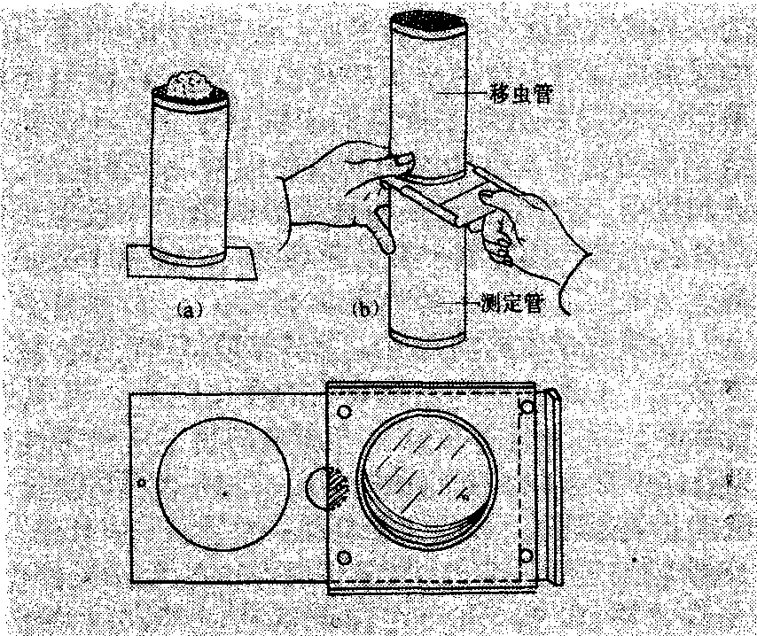 测定时先将蚊子成虫引入移虫管,每管20~25只,注意不使蚊子受伤。直立放置1小时,在此期间受伤的蚊子会落在隔板上,抽动隔板使其从小孔落出清除。然后在隔板架的另一端接上装有药纸的处理管,抽动隔板使大圆孔与两管相通,将蚊子吹入处理管,关上隔板,即开始与药剂接触,经一定时间再用上法把蚊子移回原来的管子中,关闭隔板,并在纱网上放一团糖水棉球,供其食用。24小时后检查死亡率,不能爬动的蚊子都作死虫计数。测定对滴滴涕的抗药性,用不同浓度药纸,标准接触时间为1小时。测定对马拉硫磷、杀螟硫磷等的抗药性,则用一个浓度的药纸,用不同接触时间来比较击倒50%的剂量(KD50)。 刘维德装置测定法 刘维德等1964年发明。装置由麻醉装置和测定管两部分组成(图2)。麻醉装置是