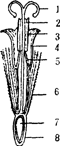 图21 管状花1.柱头 2.花柱 3.花药4.花冠 5.花丝 6.冠毛7.胚珠 8.子房