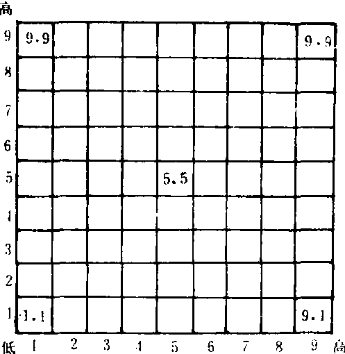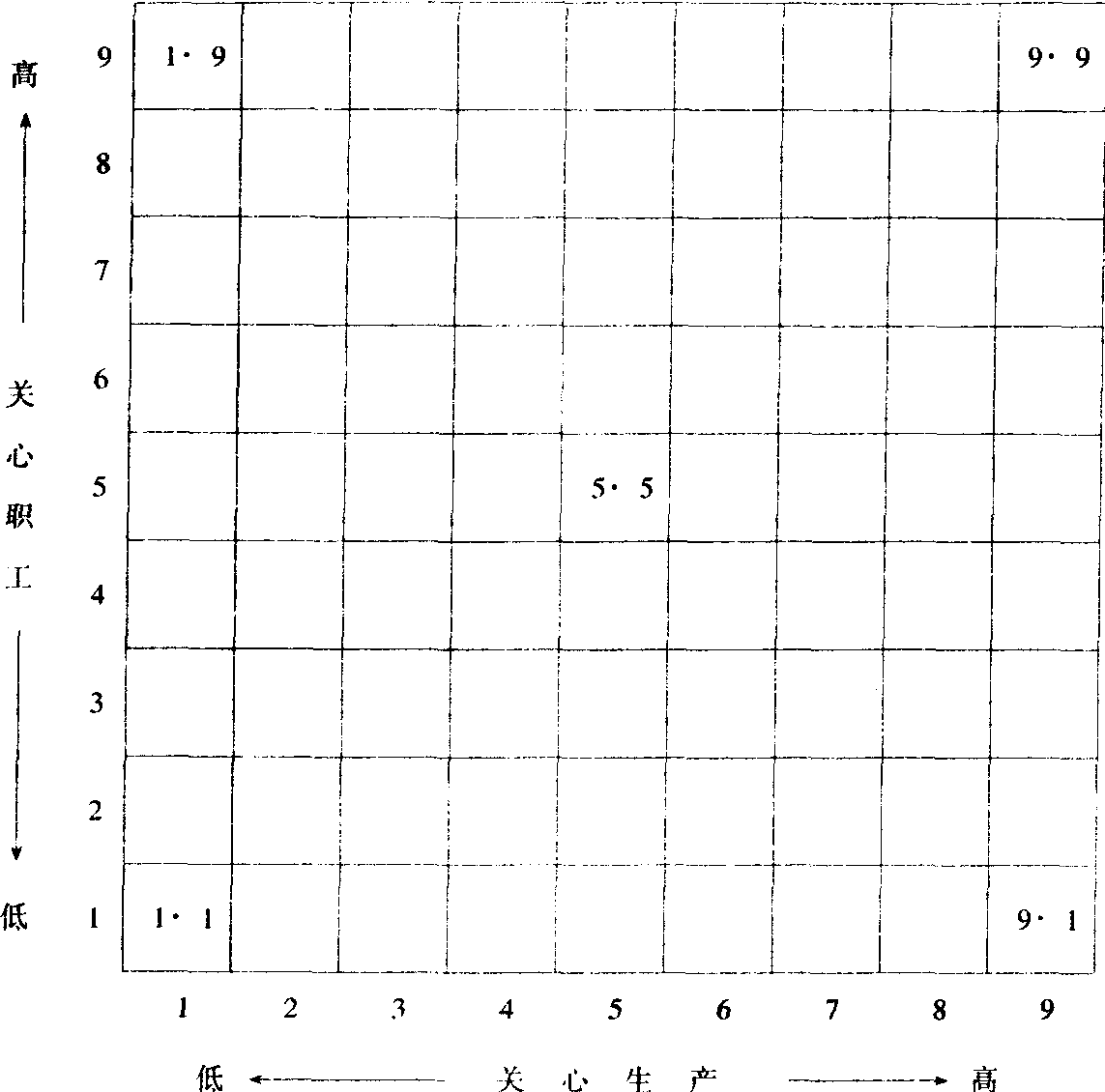 图 1 管理方格理论指美国人布莱克(Blake)和莫顿(Mowton)提出来的一种管理理论。他们以平面方格图表列举出五种具体的领导方式:(1)贫泛式管理,领导做出最低限度的努力以完成工作,对人与生产都不甚关心;(2)任务式管理,领导集中注意任务的效率,很少注意下级的发展和士气;(3)乡村俱乐部式管理,领导注意对职工的支持和体谅,不十分关心任务的效率;(4)中间式管理,目的是正常的任务效率和令人满意的士气;(5)协作型管理,领导通过协调和综合与工作有关的行动促进生产和士气。布莱克和莫顿认为“协作型”的领导方式是最有效的。 |