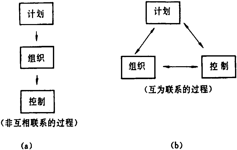 图9 图9中的右侧(b) 图较正确地反映了管理过程的内在联系,因为它体现各功能间的相互作用关系,这种关系既不是无关的、随机的联系,也不是绝对的互为前提条件的联系。相反,它们是一种动态的功能,即每一功能均在一个整体相互联结的大系统中起着完整的作用。 管理过程学派的另一特征,是发展了一系列的管理原则,例如全责的原则,即上司在给下级授权的同时,仍然对上属的工作负有全责,不能因授权而减少应负的责任。管理过程学派认为管理原则只是工作的指导方针,不是绝对不可变的。这一点在上节中已讨论过,不再赘述。 管理过程学派认为管理功能是普遍的,即在一个组织的不同层次中,均可有这些不同的管理功能存在。 管理过程学派重视发展管理哲学,要求人们回答这样的问题,诸如: 明确说明管理者做什么?哪些价值对管理者是重要的?哪些价值对工人是重要的?发展管理哲学有利于管理者搞好工作、发挥作用。他们认为管理者遵循管理过程的理论可以顺利地完成其任务,因为管理者的工作是围绕着管理职能进行的。近年来,过程学派认为发展内企业家有利于提高企业的业绩。关于这一点将在下一章进行讨论。 |