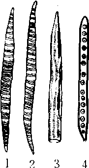 管胞的主要纹式类型 1. 环纹管胞 2. 螺纹管胞 3. 梯纹管胞 4. 孔纹管胞 |