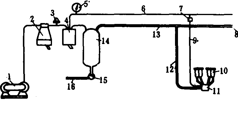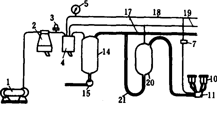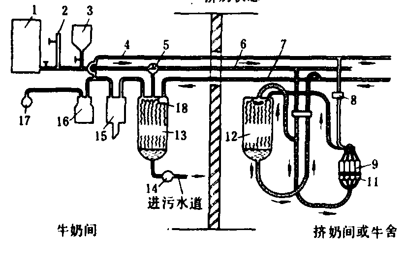 图1 管道式挤奶机 1.真空泵和动力装置;2.真空罐;3.真空调节器;4.气液分离罐; 5.真空表; 6、18.脉动器用真空管路;7.脉动器; 8.挤奶管路; 9.脉动真空软管; 10.挤奶杯; 11.集乳器; 12.牛奶软管;13、19.挤奶真空管路;14.集奶罐;15.牛奶泵; 16.牛奶排出管路;17.输奶管路;20.牛奶计量器; 21.输奶软管 挤奶间管道式挤奶机 安装在挤奶间内的管道式挤奶机,简称挤奶间式挤奶机。由挤奶台、挤奶器、真空装置、管路系统、清洗装置和多种辅助设备等组成。辅助设备有清洗乳房的热水和喷洗设备、奶牛进出挤奶栏门的闭门机构、自动喂精料的装置、挤奶杯自动摘卸装置(见奶牛挤奶设备)、牛奶冷却贮存罐等。其设备利用率高,生产率高,容易实现机械化管理。 挤奶间式挤奶机一般均配置牛奶计量器,牛奶需先经计量器计量(或抽样检测奶质),再流入集奶罐,挤奶和输奶分设两条独立的管路[图1(b)],使挤奶杯的乳头室内有较稳定的真空。在挤奶间内设有低于地面的工作坑,可采用低配管式输奶管路,管路配置低于牛站立的平面,因而不必使用高的真空度来提升牛奶,不易引起真空不稳定。 主要组成部分 管道式挤奶机用真空装置 用以供应挤奶器及由管路系统输送牛奶所需的真空。真空泵所需抽气量比提桶式挤奶机大。其必须抽气量为150+60n升/分;必须贮备量为100+25n升/分。其中n为同时工作的挤奶器数。 管路系统 管路由不锈钢管或硼硅玻璃管制成。每一条25毫米管径的挤奶管路上同时开动的挤奶器数不应超过4套。输奶管路应向集奶罐方向徐徐倾斜,以利于牛奶顺利流向集奶罐。 气液分离罐 是一玻璃容器,安装在真空罐与集奶罐之间的真空管路上,使真空管路与有可能接触牛奶的管路分开,防止牛奶或其他液体泄入真空管路和真空泵内。其有效容积不小于3升,内有防止液体溢入真空罐的浮球阀,底部装有排液阀。 集奶罐 安装在输奶管路的一端,汇集由输奶管路输入的牛奶,并使奶、气分离。罐的容量不小于23升。底部装有吸排器。常用的吸排器为不锈钢制的离心式奶泵,内有开启式单片叶轮,流量为4500~6300升/小时,扬程达3米。奶泵的工作是由集奶罐重量或罐内液面高低来控制的。重量控制是利用奶罐中的牛奶达到规定重量后,使奶罐下降,通过杠杆推动开关,启动奶泵;奶排出后,奶罐重量减轻而上升,使奶泵停止工作。液面控制装置由插入奶罐内的三根不同长度的金属棒和继电器组成,在奶液平面升高到与短棒接触时接通电路,启动奶泵排奶;当奶液平面降到离开长棒时奶泵停止工作,第三根棒为共同的电回路,采用电压为12伏的直流电源。 清洗装置 用来清洗残留在输奶管路、容器等表面上的奶垢等污物,杀死残留的细菌和微生物。包括热水器、洗涤液添加箱、洗涤槽(或洗涤挤奶杯的喷嘴)、转换阀门等。早期国际上流行的是蒸汽杀菌,以后发展用化学药剂洗涤,20世纪80年代以来使用洗涤剂加热水的办法来进一步提高清洗和杀菌效率。标准的清洗——杀菌法是:挤奶结束后立即用冷水冲洗残留在管壁和容器壁上的牛奶,再用含有次氯酸盐的热洗涤溶液(温度为60~80℃)冲洗管道约15分钟。图2为管道式挤奶机的清洗装置工作过程。在清洗时将挤奶真空管路上的转换阀门转到热水箱与挤奶真空管路接通的位置,使管路系统处于清洗状态。在半自动装置中,控制电路内装有定时器,使洗涤、杀菌、冲洗等过程以预定的程序自动进行,但需用人工配制浓度正确和温度合适的洗涤溶液。在全自动装置中,除整个过程全部自动化外,还能使进入管道中的洗涤——杀菌剂停留若干时间后再进行冲洗,并在清洗过程中间断放入空气,促使液流形成涡流,加强清洗效果。 挤奶台 奶牛在挤奶间式挤奶机挤奶时站立的地点。按工作方式可分为固定式、转台式和传送带式;按奶牛在挤奶台上的排列方式可分为并列式、侧进式、通道式和斜列式(图3)。按挤奶台围绕工作坑四周的边数又可分为单边形、双边形和多边形等。并列式固定挤奶台的挤奶栏与牛舍的牛床排列相似,牛与工人位于同一平面或高出250~400毫米,以减少弯腰操作。奶牛可单独进出挤奶栏。每人每小时挤奶不超过35头。侧进式固定挤奶台的挤奶栏排列在工作坑的两边, 牛在挤奶栏内头尾相接, 栏侧有前、后门, 供牛单独进出, 工作坑低于地面800~900毫米。通道式固定挤奶台与侧进式相似, 挤奶栏分隔门拉出时就形成统一的挤奶栏通道, 奶牛须按批进出, 但挤奶间跨度小。侧进式和通道式挤奶台上前后挤奶器之间的距离有2.4米, 为避免操作者走动距离过长, 每一工作边的挤奶栏数常为2~3个。侧进式挤奶台配合辅助操作的机械化, 每人每小时最高可挤奶50~63头。斜列式固定挤奶台上挤奶栏排列方向与工作坑纵轴成30°~55°角, 奶牛分批进出挤奶栏, 但前后挤奶器之间的距离缩短到0.9米, 所以在挤奶间长度相同的情况下可设置较多的挤奶栏(每边4~10个), 每人每小时最高可挤奶83~92头, 多边形挤奶台较常见的是菱形, 每工作边都有一排斜列式挤奶栏, 每边4~8栏, 每人每小时最高可挤奶牛96~122头。挤奶速度慢的奶牛可安排在一条工作边上, 以减少对挤奶间生产率的影响。