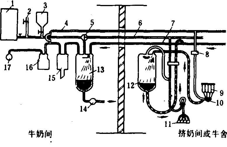 图3 挤奶台的类型 传送带式挤奶台由若干作串联排列的挤奶栏组成, 挤奶栏上装有轮子,由一传送链带动,在轨道上围绕一个矩形工作坑转动。工作坑内一人操作,每人每小时可挤奶牛数80~120头。 栏门启闭机构代替手工及时开闭挤奶栏门,供奶牛按正确的方向进出,栏门由压缩空气通过活塞连杆机构操纵,在工作坑内控制。 管道式挤奶机pipeline milker一种固定式挤奶机。工作原理与桶式挤奶机相同,不同之处在于不用奶桶盛奶,而是将挤奶杯中的奶用管道直接送往盛奶容器,因而在管路中增加了奶气分离器和输奶泵。如在管道式挤奶机中加上计量器,则称为计量式挤奶机。 |