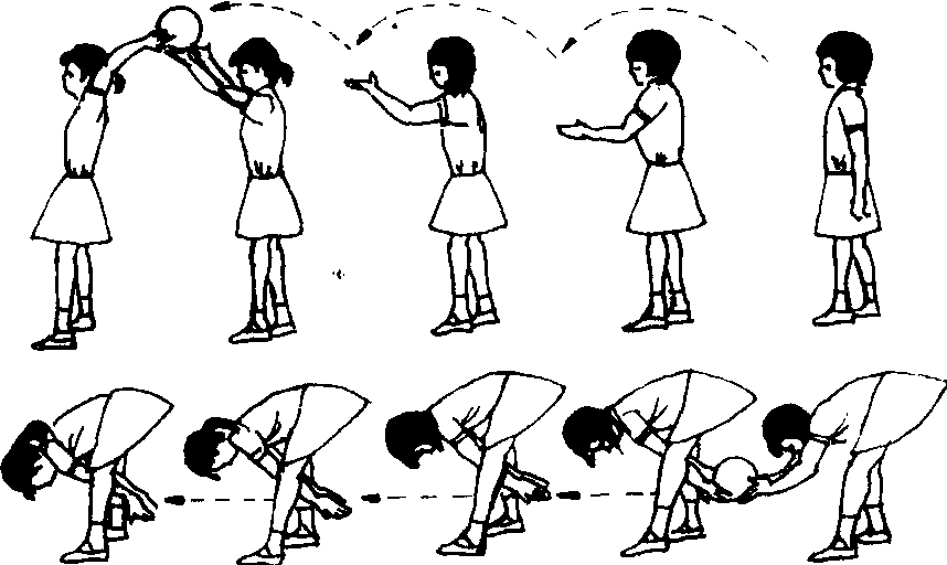 游戏方法 把学生分成人数相等的3—4队,各队排成一路纵队,队间距离2—3米。学生前后距离为一臂,两脚左右开立,排头拿一个小篮球。游戏开始后,各队排头将球从头上手递手地向后传, 排尾再把球由两腿之间手递手地依次往前传,排头把球举起。以先完成的队为胜。 游戏规则 ❶传球时,不得越人抛球和传地滚球。 ❷如球落地, 由掉球人拾起, 从失误处继续传递。 |