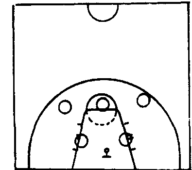 ❹挤过 当掩护队员即将完成掩护配合的一瞬间,被掩护队员及时抢占位置,从两名进攻队员之间挤过去,继续防守自己的对手的一种防守配合。