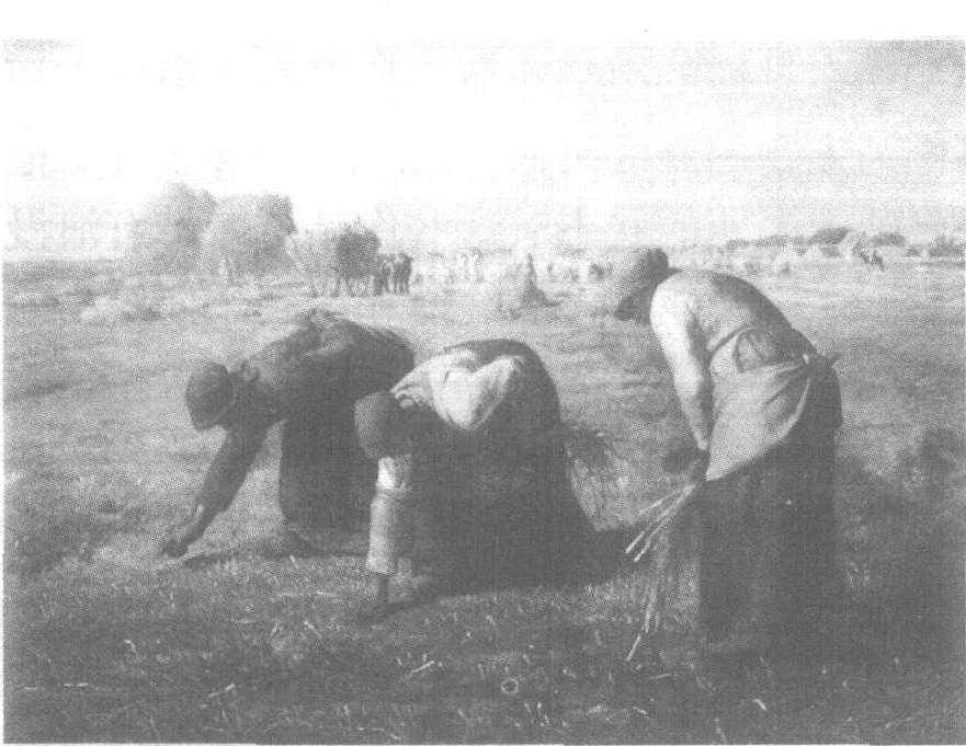 | 释义 | 米勒《拾穗》在渐渐远去的广阔田野和接近模模糊糊的地平线的背景上,画家描绘进了三个农妇弯着腰的重复姿势——一种让人联想到累断脊骨的劳动的姿势。拾穗者的形象在米勒居住巴比松的头几年里,就以素描的形式出现了。开始动态造作,不久删掉又重画,直到最后较为定型。终于以古典手法,创作出了这一幅法国绘画史上的杰作。画中每一根线条,甚至拾穗者手中的麦叶,米勒都精推细敲过。在人物与背景的关系上,他也花费了不少的心思。他始终设想在人物背后筑起一个大干草堆来。他把阳光下劳动者的艰辛表达得如此传神与不朽,同时画中也透露出一种充满大气的美,这色彩魔术般地烘托出形体的立体感。不过米勒在这里不只是表现了 一种切身的生活体验,而且他想暗示出所谓 “劳动” 也有一般精神上和宗教上的价值。他曾说: “我所希望的是人们在进行劳动,具有安静、朴素和善良的感情。”