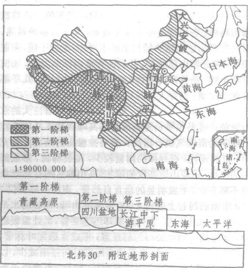 | 释义 | 中国地形的特点Zhongguo dixing de tedian我国地形壮丽多姿,其基本特点,概括地说有三点:❶地势西高东低,呈阶梯状分布。我国地处亚欧大陆的东南部,地势西部高而东南低,西部多高山和高原,东部沿海多丘陵和平原,形成一个以西南部的青藏高原最高,由西向东逐级下降的阶梯状斜面。由两列山岭组成的地形界线,将我国地形明显地分成三级阶梯。西面一列是昆仑山—祁连山—岷山—邛崃山—横断山脉,简称“昆仑线”。东面一列是大兴安岭—太行山—巫山—雪峰山线,简称“兴安线”。被“昆仑线”包围的青藏高原属第一级阶梯,平均海拔约4 500米,是世界上最高的大高原,号称“世界屋脊”。高原上分布着一系列雪峰连绵的巨大山脉,山岭间镶嵌着辽阔的高原和盆地。越过“昆仑线”,即青藏高原的北缘和东缘,地面迅速下降到1 000—2 000米之间,局部地区在500米以下,属第二级阶梯。它是由一系列的高山、高原和被它们包围着的盆地所组成。如内蒙古高原、黄土高原、云贵高原以及塔里木盆地,海拔大都在1 000—2 000米之间,准噶尔盆地、四川盆地的大部分则下降到500米以下。高原盆地之间的阿尔泰山、天山的海拔都超过4 000米,阴山和秦岭也在2 000米以上。在“兴安线”以东,地势突降到500米以下的第三级阶梯,主要由宽广的平原与丘陵所组成。如东北平原、华北平原和长江中下游平原的海拔都在200米以下。这些平原的边沿分布破碎的低山丘陵,如东北平原东缘的长白山脉,华北平原东边的山东丘陵,长江中下游平原以南的江南丘陵等。从这一级阶梯往东是大陆向海洋延伸的大陆架,水深大部分在200米以内。