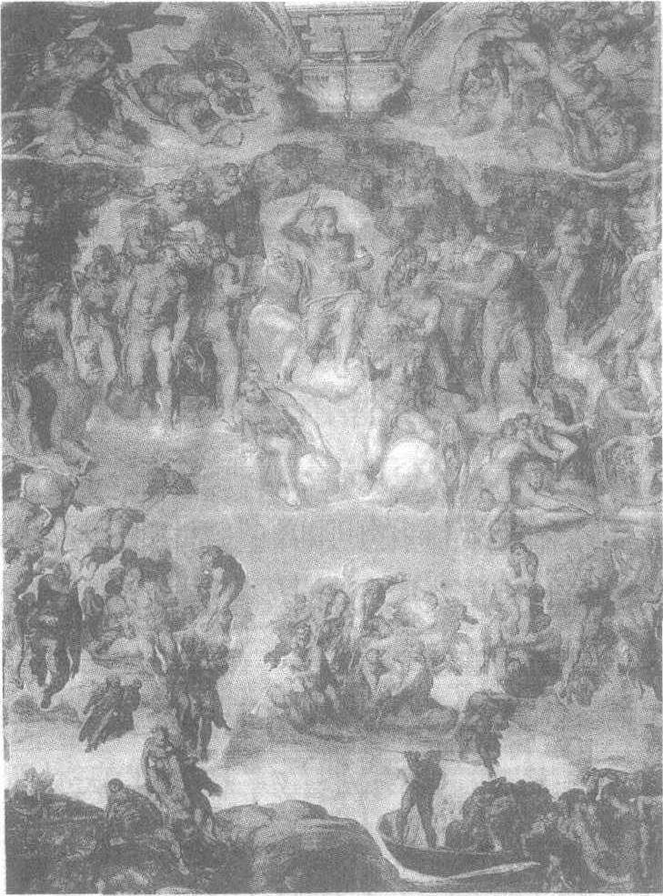 最后的审判 米开朗基罗 在天主教世界的大本营梵蒂冈,西斯廷礼拜堂就像一座坚固的要塞,高高耸立在离壮丽的圣·彼埃特罗教堂不远的一侧。当我们步入静静的礼拜堂,正面墙壁上一幅巨大的壁画《最后的审判》,立即映入我们的眼帘。它占满了整片墙壁,高14.4米,宽13.3米,可以说是世界上最大的壁画。66岁的米开朗基罗,在西班牙人劫城后的1541年奉教皇保罗三世之命,花费了5年半的岁月,才完成了这幅鸿篇巨制。“它使整个罗马惊讶了”(瓦萨里语)。